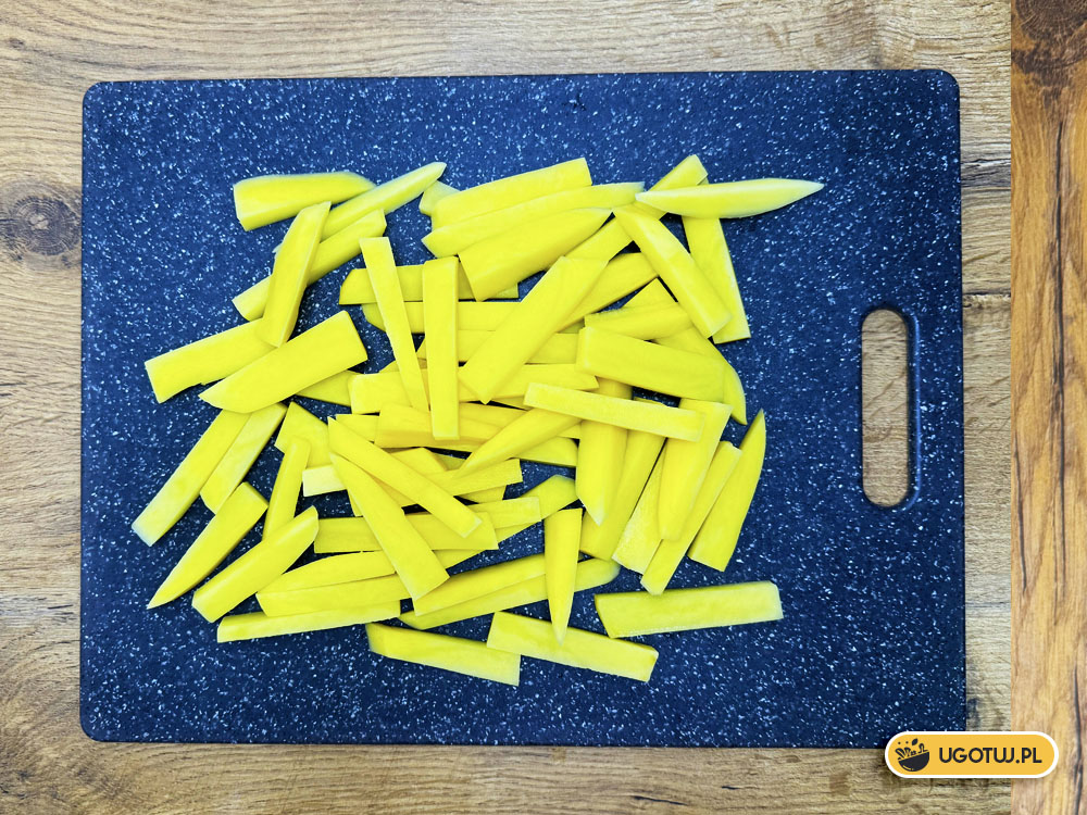 - Ziemniaki obierz, umyj, a następnie pokrój w słupki o szerokości, nie większej niż 1 cm.