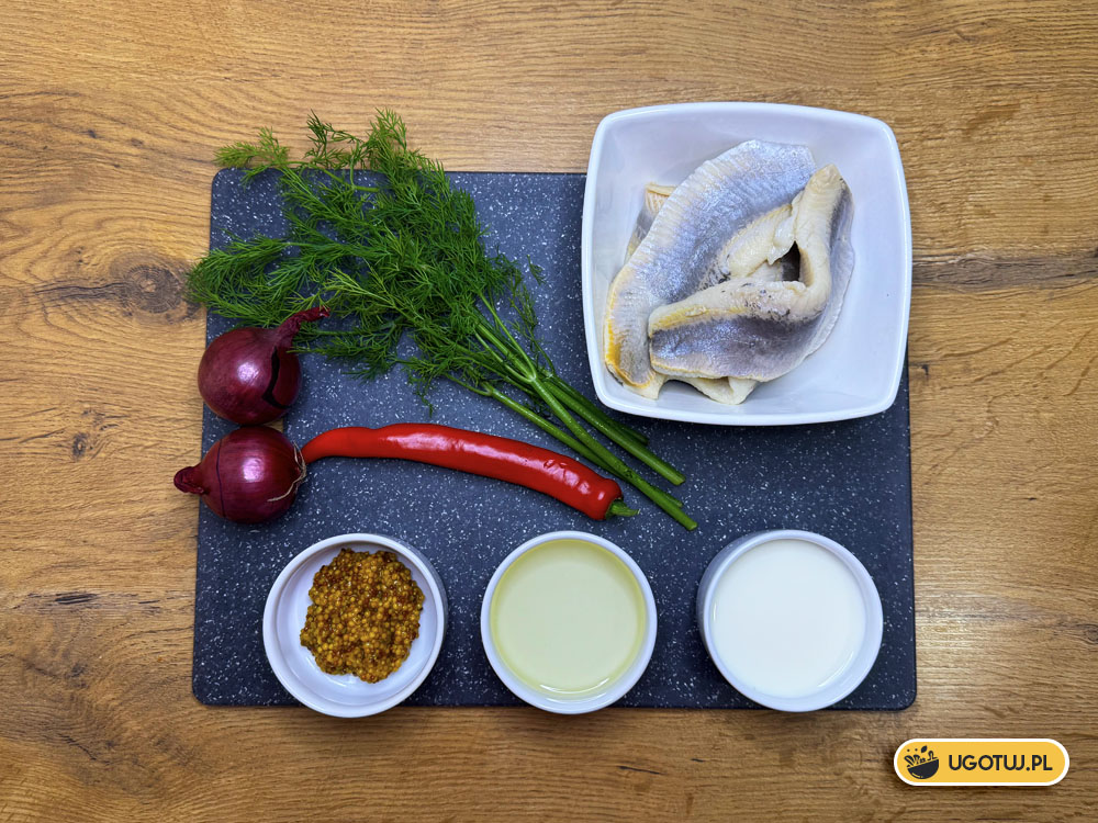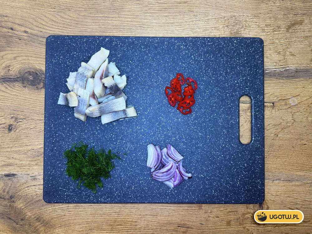 - Filety śledziowe namocz w mleku przez 2/3 godziny, następnie odsącz i pokrój na mniejsze kawałki, przełóż do miski. Cebulę obierz i pokrój w piórka, papryczkę i koperek umyj, osusz i drobno posiekaj, całość dorzuć do śledzi.